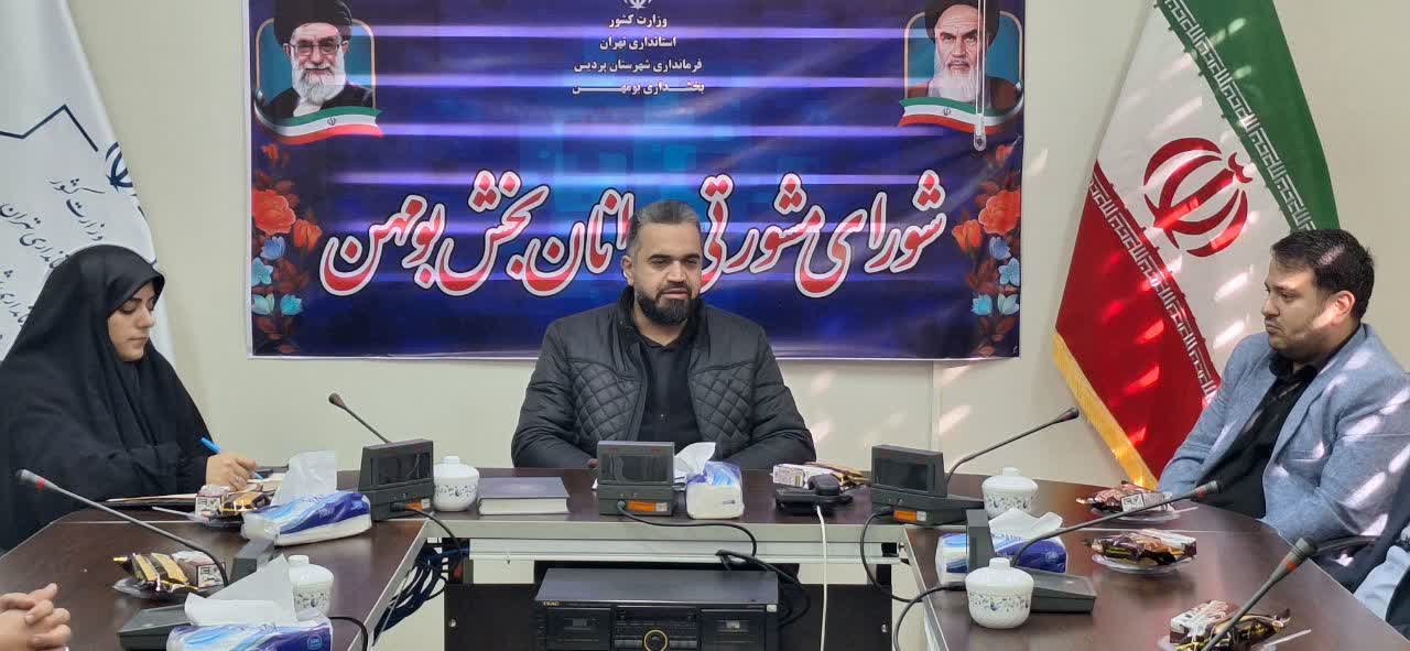 ششمین جلسه شورای مشورتی جوانان بخش بومهن با حضور بخشدار، اعضای شورا و نخبگان محلی با هدف تبیین جایگاه بصیرت در عبور آگاهانه از مقاطع حساس و بررسی راهکارهای ارتقای مشارکت آگاهانه مردم در انتخابات شوراها برگزار شد.